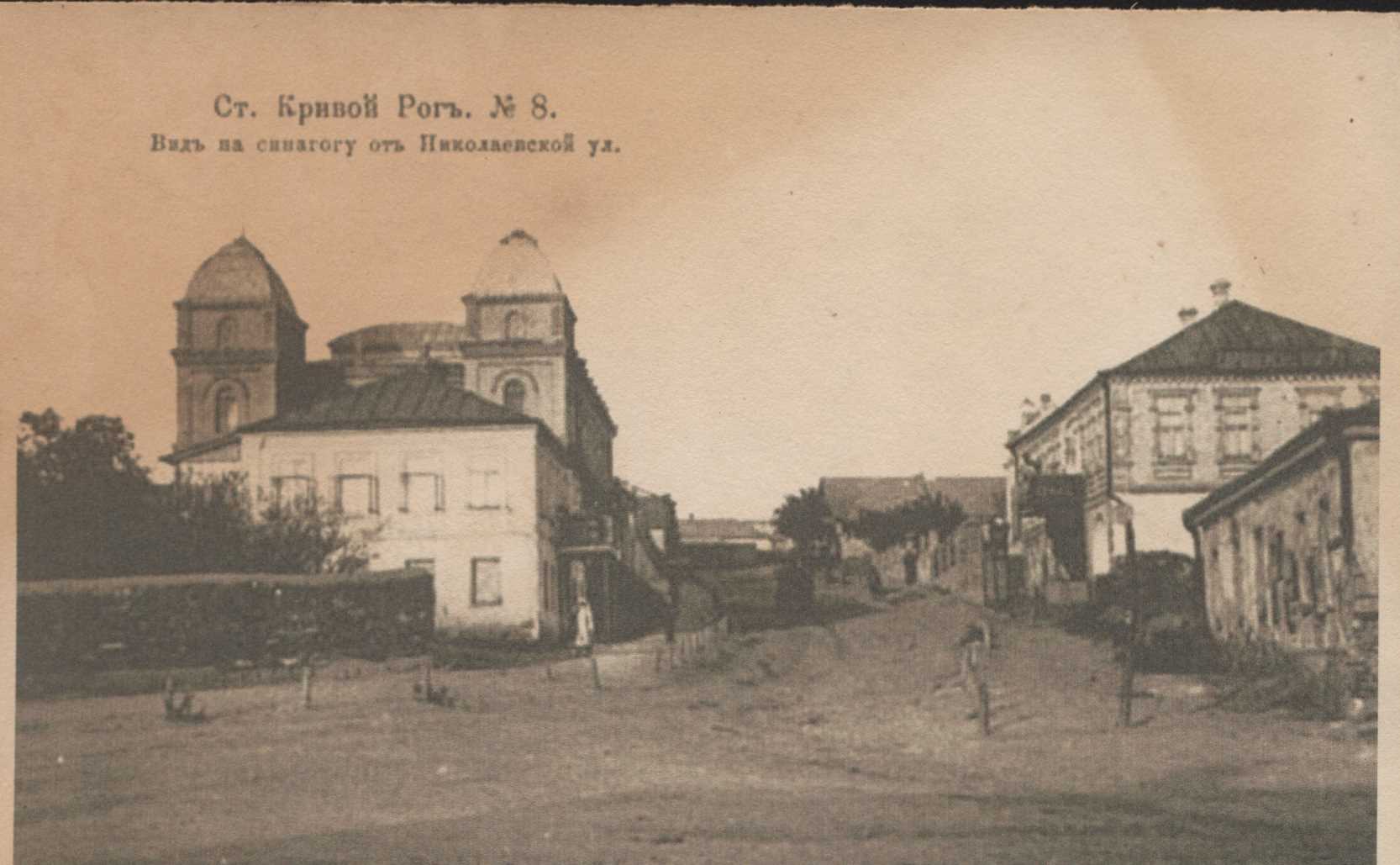 View of the synagogue from Mykolayivska St., Kryvyi Rih. Postcard.